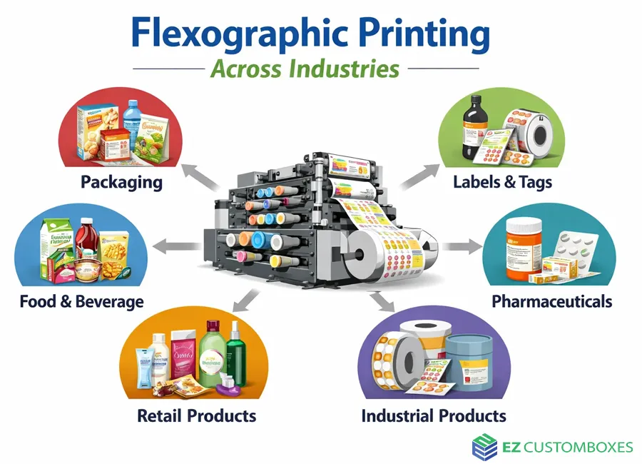 Flexo printing is ideal for labels, flexible packaging, folding cartons, and corrugated materials, especially for high-volume production.